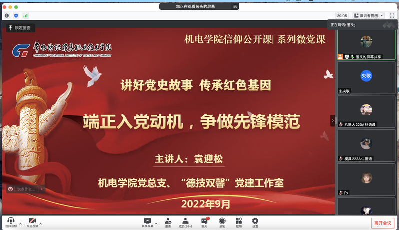 “德技双馨”党建工作室负责人、学生工作党支部书记袁迎松为同学们作了一场《端正入党动机,争做先锋模范》讲座。讲座围绕党的性质、宗旨、指导思想,就新时代师生党员如何端正入党动机争做时代先锋进行了生动讲授。