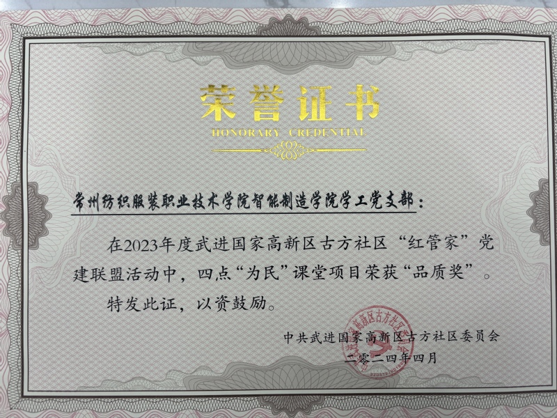 4月19日,在常州古方社区“红管家”党建联盟表彰大会上,智能制造学院学生工作党支部四点“为民”课堂项目荣获“品质奖”。
