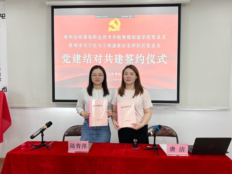 为深入贯彻落实党的二十大精神,进一步夯实基层党建工作基础,强化基层党组织政治功能,实现高校与社区在基层党建工作中的资源共享、优势互补,6月27日下午,常州纺织服装职业技术学院智能制造学院党总支与常州市天宁区街道前后北岸社区党总支党建结对共建签约暨暑期社会实践基地授牌仪式于前后北岸社区党群服务中心会议室举行。