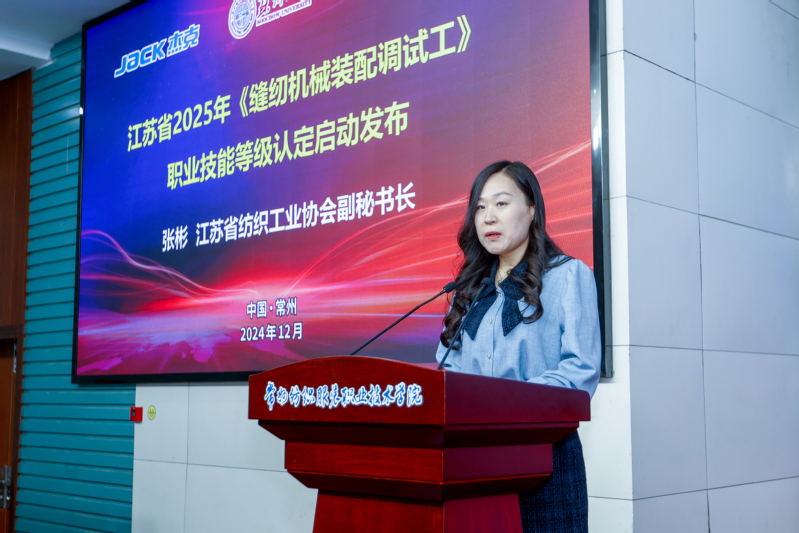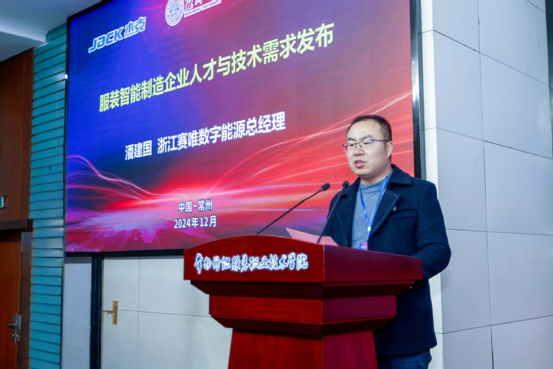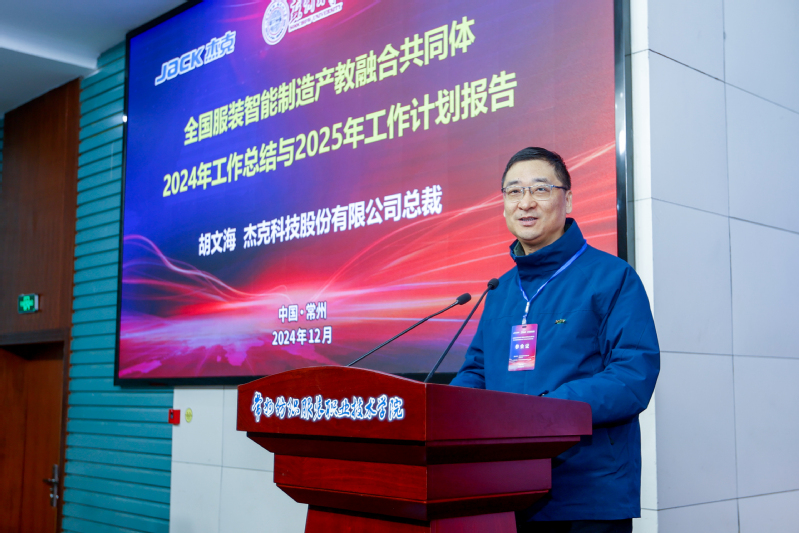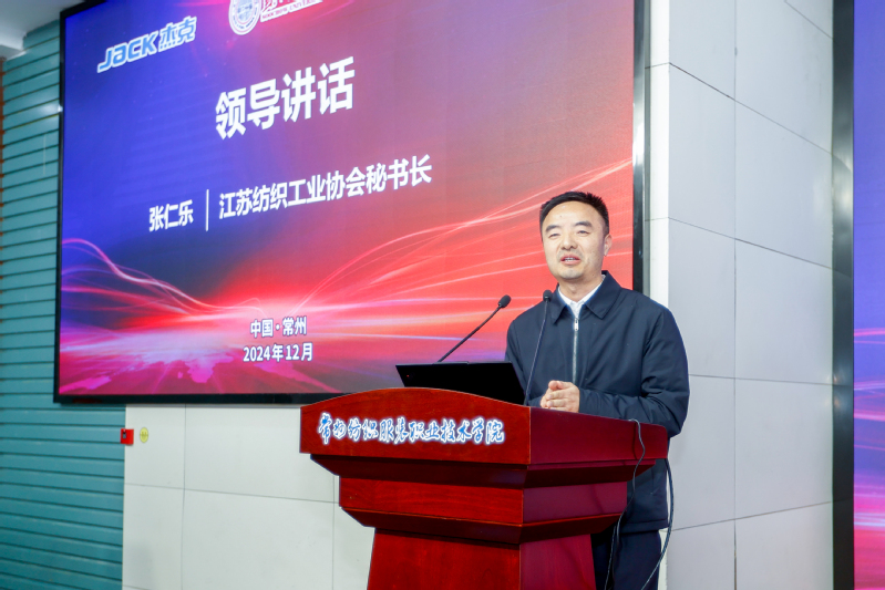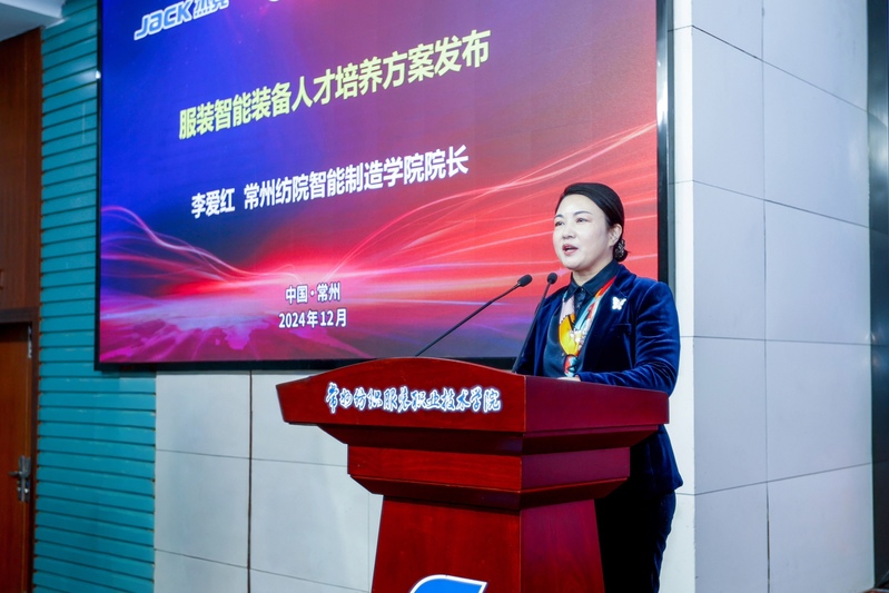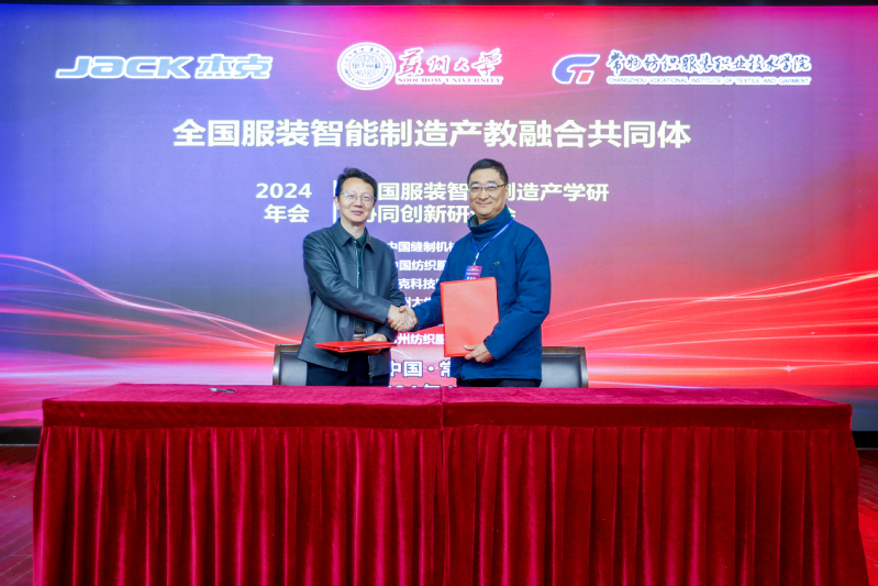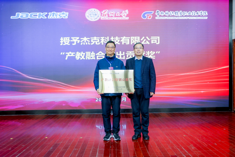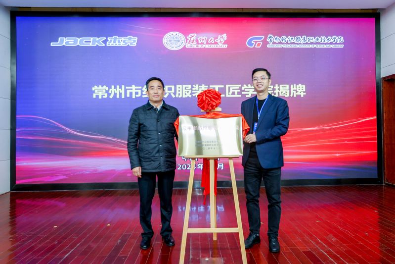 杰克科技股份有限公司总裁胡文海对共同体成立以来的工作进行了总结,并制定了下一年度工作计划。校长洪霄、杰克科技总裁胡文海分别代表双方签署了“校企协同创新合作协议”,通过共建服装智能制造技术创新与应用平台,进一步深化校企合作。常州市科教城管委会副主任庄三舵、常州华利达服装集团有限公司副书记钱震宏共同为“常州市纺织服装工匠学院”揭牌,希望通过共建工匠学院,培养更多具备工匠精神的纺织服装人才,推动纺织服装行业技术创新。为表彰杰克科技在产教融合领域做出杰出的贡献,校党委委员、副院长张文明代表我校授予杰克科技产教融合“突出贡献奖”。江苏省纺织工业协会副秘书长张彬发布了江苏省2025年《缝纫机械装配调试工》职业技能等级认定,这将为服装智能制造领域的人才培养标准和技能评价规范。我校智能制造学院院长李爱红发布了我校机电一体化技术(服装智能装备方向)人才培养方案。浙江赛唯数字能源总经理潘建国发布了服装智能制造企业人才与技术需求。