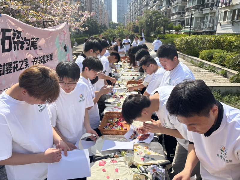 活动伊始,怡康花园社区小郑老师为在场师生带来了一场生动的非遗文化讲座,从植物拓染的历史渊源讲起,详细介绍了这项源自唐代的古老技艺。在实践环节,师生们精心挑选花草叶片,通过布局、敲打、固色等工序,将大自然的馈赠永久留存在布包上。锤起锤落间,原本素雅的布包逐渐绽放出独特的艺术光彩,每一件作品都凝聚着匠心与创意。在互动交流环节,大家纷纷表示,要将这份文化自信转化为行动自觉,做非遗传承的践行者和推广者。